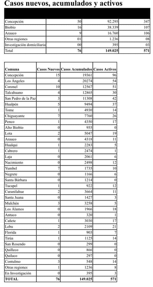 Junto con las cifras oficiales diarias, la Seremi de Salud informó que las comunas con mayor tasa de incidencia corresponden a Alto Biobío con 14.095,9 casos por cada 100 mil habitantes; Negrete, con 11.180,4 casos por cada 100 mil; y Arauco, con 11.163,7 casos por cada 100 mil habitantes.