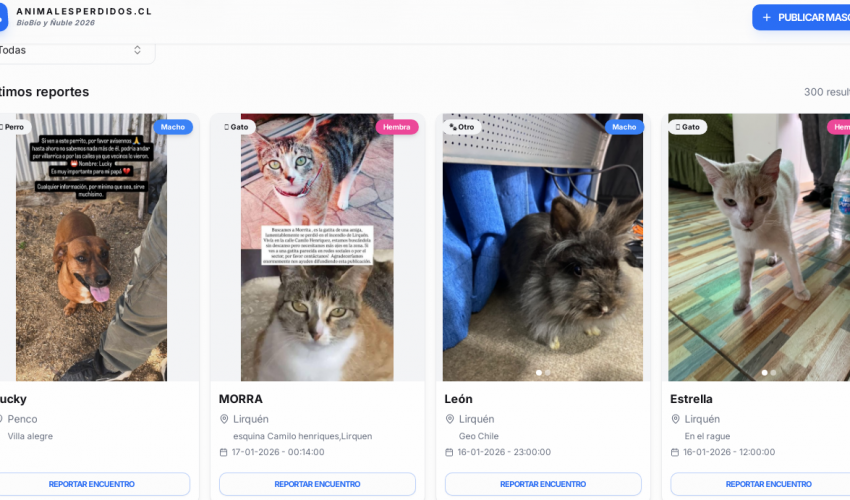 Ante esta crítica situación es que se quiso aportar una solución a quienes sufren en distintos puntos de Biobío o Ñuble y desarrollaron la página web animalesperdidos.cl para recopilar en un lugar todos los datos sobre mascotas extraviadas o rescatadas, y facilitar su difusión, seguimiento y reencuentro con su familia.
