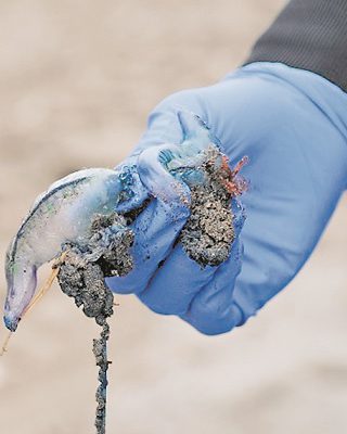 La fragata portuguesa secreta una neurotoxina que en contacto con las personas puede producir irritación y generar también colapso cardiorespiratorio al simple contacto con especies vivas o muertas.