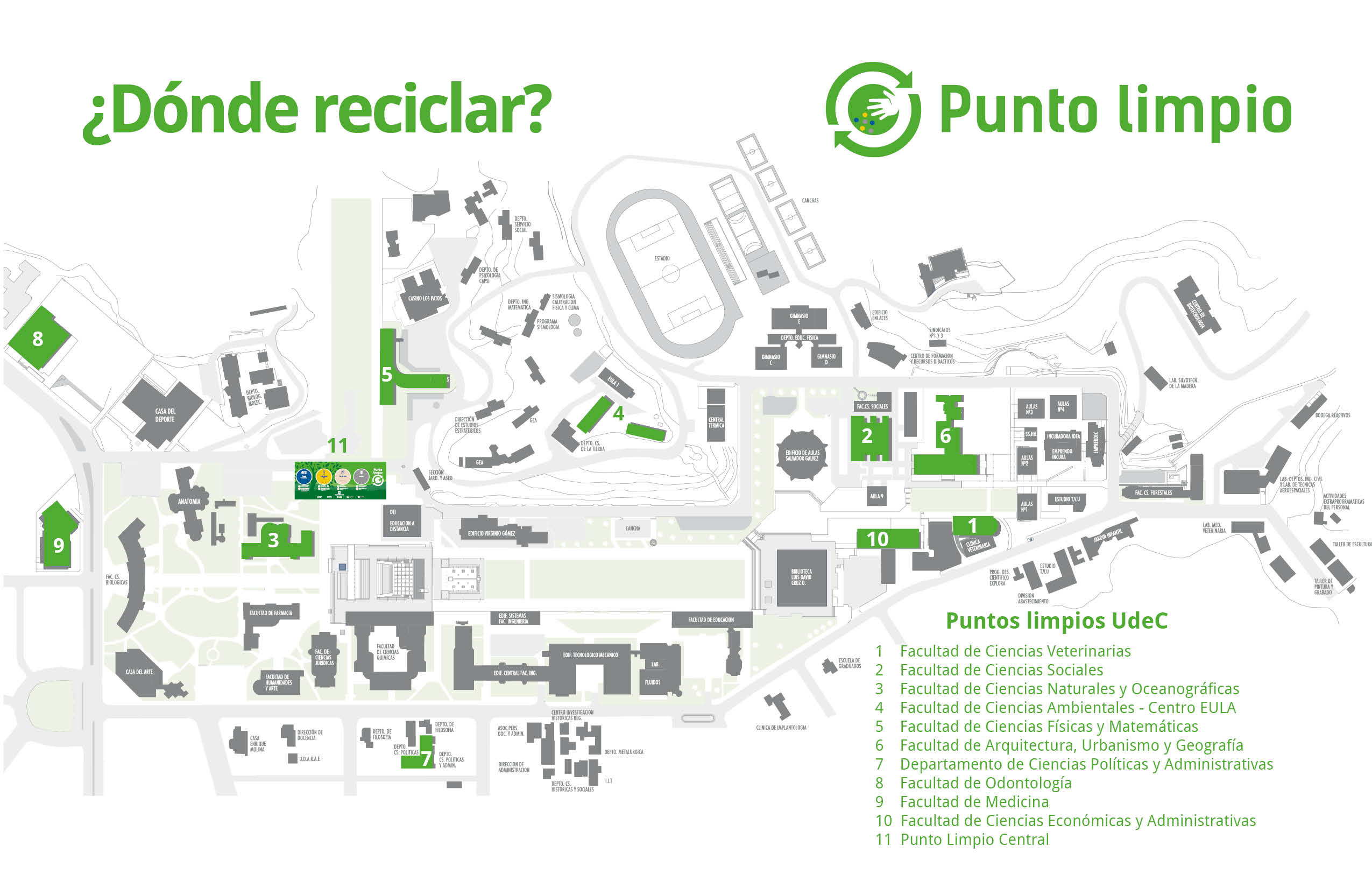 La Universidad de Concepción ha implementado sus propios puntos limpios en Campus Central. Matpel, centro encargado del manejo de residuos y sustancias peligrosas, decidió dar soporte y continuidad a una iniciativa estudiantil de Sur Sustenta, quienes en 2012 implementaron varios puntos.