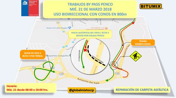 Hasta las 18:00 horas de este miércoles estará suspendido el ingreso desde el bypass de Penco hacia la Ruta 5 Sur debido a trabajos en la vía.