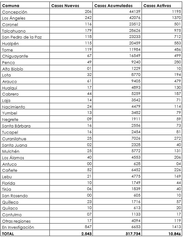 El Seremi (s) de Salud del Biobío, Hugo Rojas, detalló que la región “registra 317.734 casos acumulados de Covid-19, 195.482 en la provincia de Concepción, 76.322 en Biobío, 35.183 en Arauco, 4.094 de otras regiones y 6.653 en investigación domiciliaria. Adicionalmente se registran 10.846 casos activos, 5.639 en la provincia de Concepción, 2.266 en Biobío, 1.409 en Arauco, 119 en otras regiones y 1.413 casos en investigación domiciliaria”.