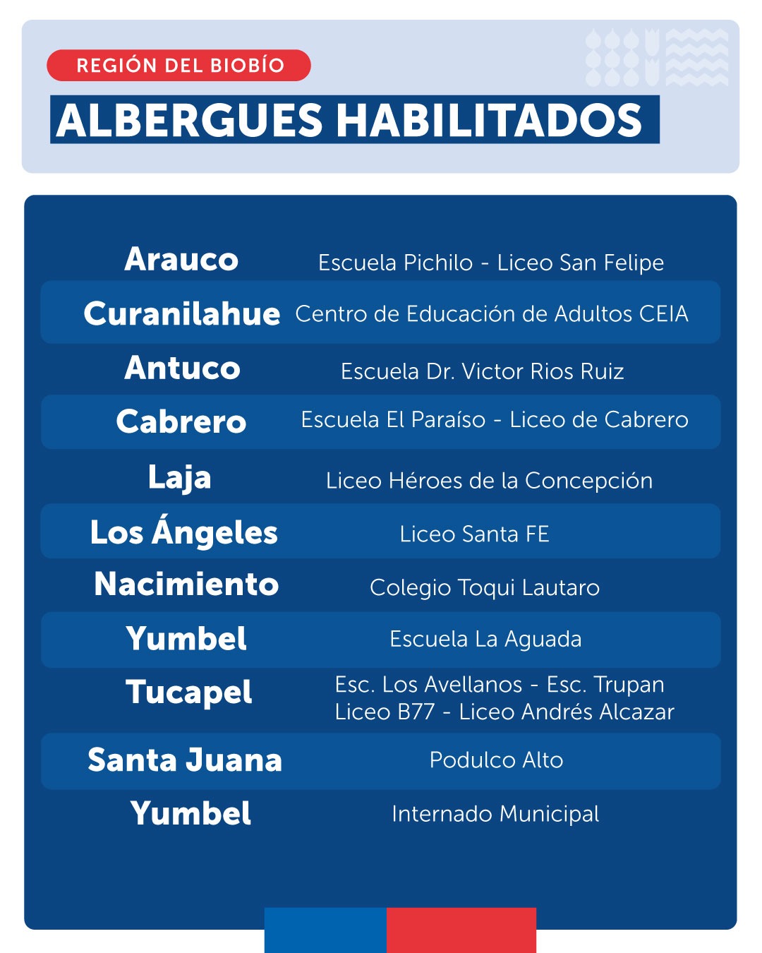 La Delegación Presidencial Regional del Biobío informó la habilitación de 16 colegios como albergues para recibir a damnificados por el sistema frontal que afecta al centro sur del país.