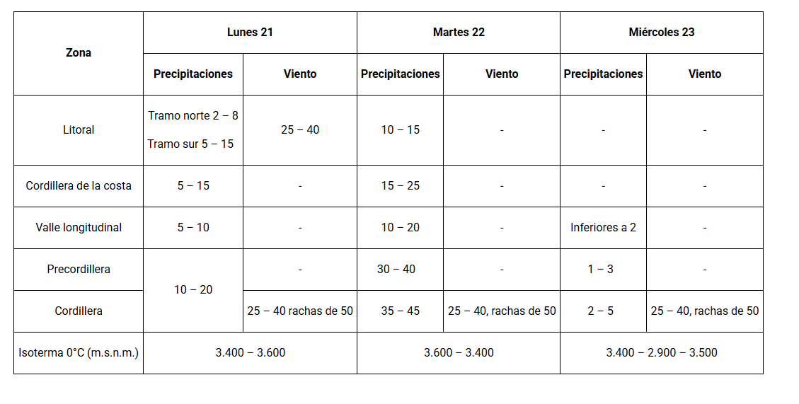 En el informe emitido por Senapred, se indica que “conforme a lo indicado en el Informe de Amenaza Meteorológica de la DMC emitido el día de hoy, los montos de precipitación (mm) y viento (km/h) pronosticados para la región son los siguientes”: