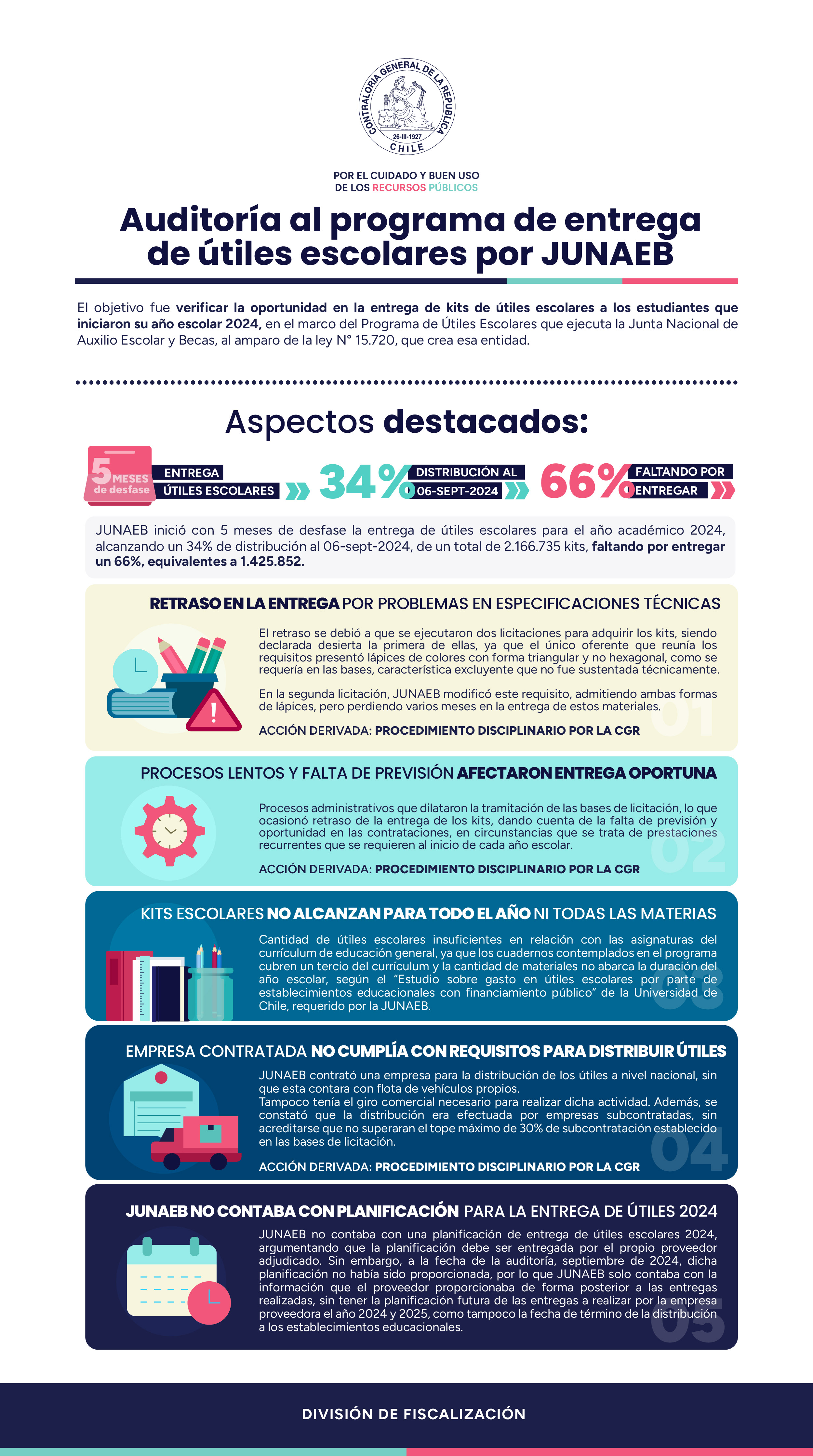 “Cinco meses de retraso en la entrega, sólo un 34% de distribución al 6 de septiembre de 2024 y un total de 1.425.852 kits faltantes por distribuir fueron las principales falencias que detectó la Contraloría General, en el marco de una Investigación Especial (INVE) al Programa de Útiles Escolares que efectúa la Junta Nacional de Auxilio Escolar y Becas (Junaeb)”, así lo comunicó la CGR en una reciente nota de prensa.