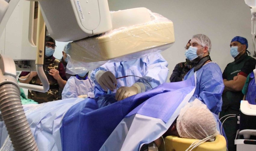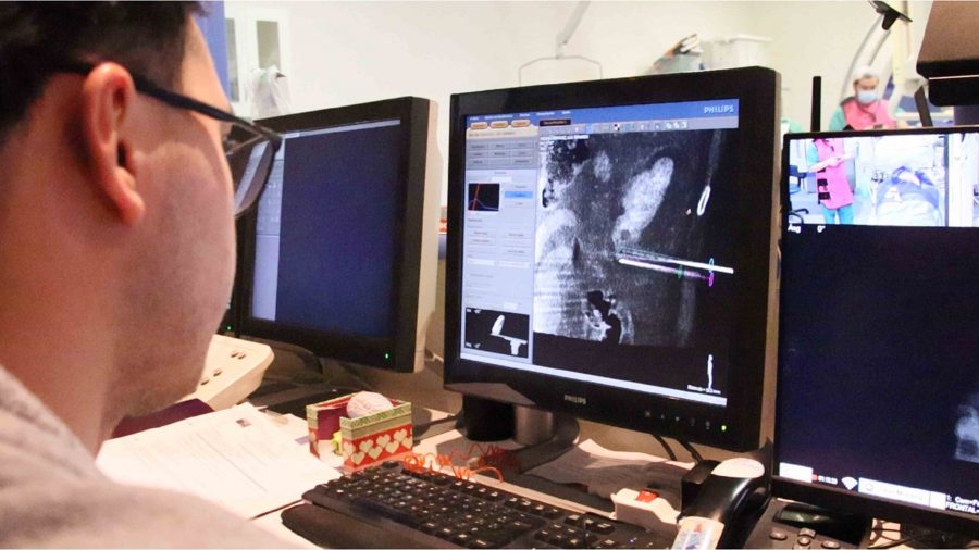 “Se puso al paciente boca abajo. Ingresamos un catéter por la muñeca, cosa que no siempre es necesario, para llegar hasta el riñón y lograr ver bien el riñón y el tumor. Una vez que llegamos con el catéter hasta la arteria renal, le hicimos un escáner con inyección de contraste directa al riñón, ahí se visualizó el riñón y el tumor (…) Luego planificamos la posición que iban a tener las agujas y después de eso pinchamos con estereotaxia (las agujas)”, detalló Clemo.