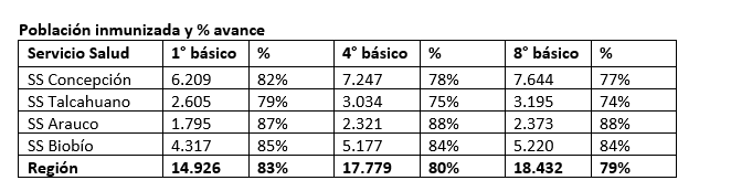 Según el último balance entregado por la Seremi de Salud del Biobío señalan que la Región del Biobío presenta un avance de un 80,7% en la Campaña de Vacunación Escolar. Han sido inmunizados 51.137 estudiantes, de un total de 63.329 habilitados.