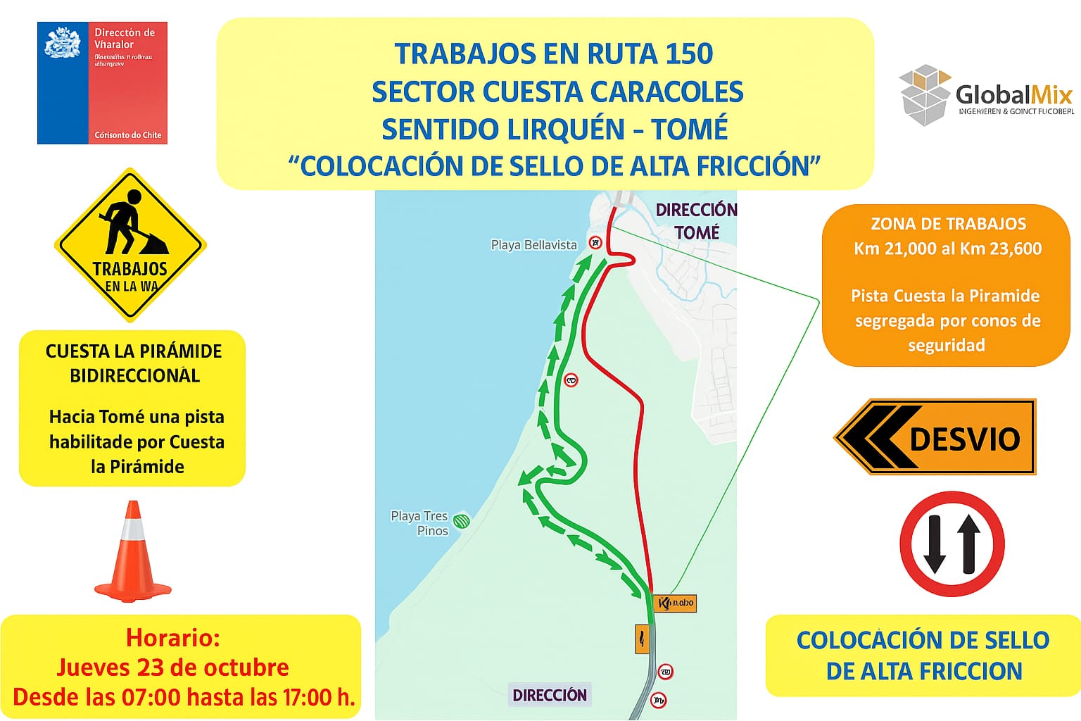 TransporTeinforma, a través de su cuenta de X, dio a conocer que la cuesta La Piramide de la Ruta 150 de Tomé operará de forma bidireccional durante la tarde de este jueves.