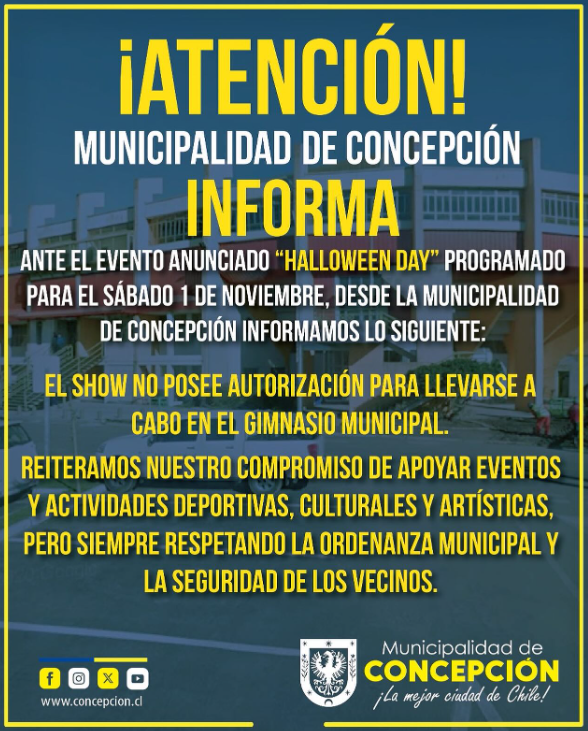 “Ante el evento anunciado “Halloween Day” programado para el viernes 1 de noviembre, desde la Municipalidad de Concepción informamos lo siguiente: El show no posee autorización para llevarse a cabo en el Gimnasio Municipal”, sostuvo la oficina comunal.
