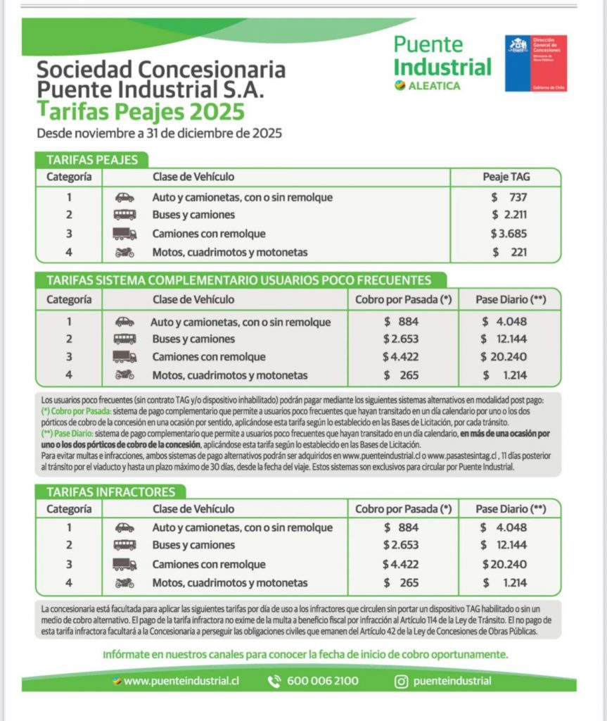 La Sociedad Concesionaria Puente Industrial publicó de manera oficial las tarifas de peajes 2025.