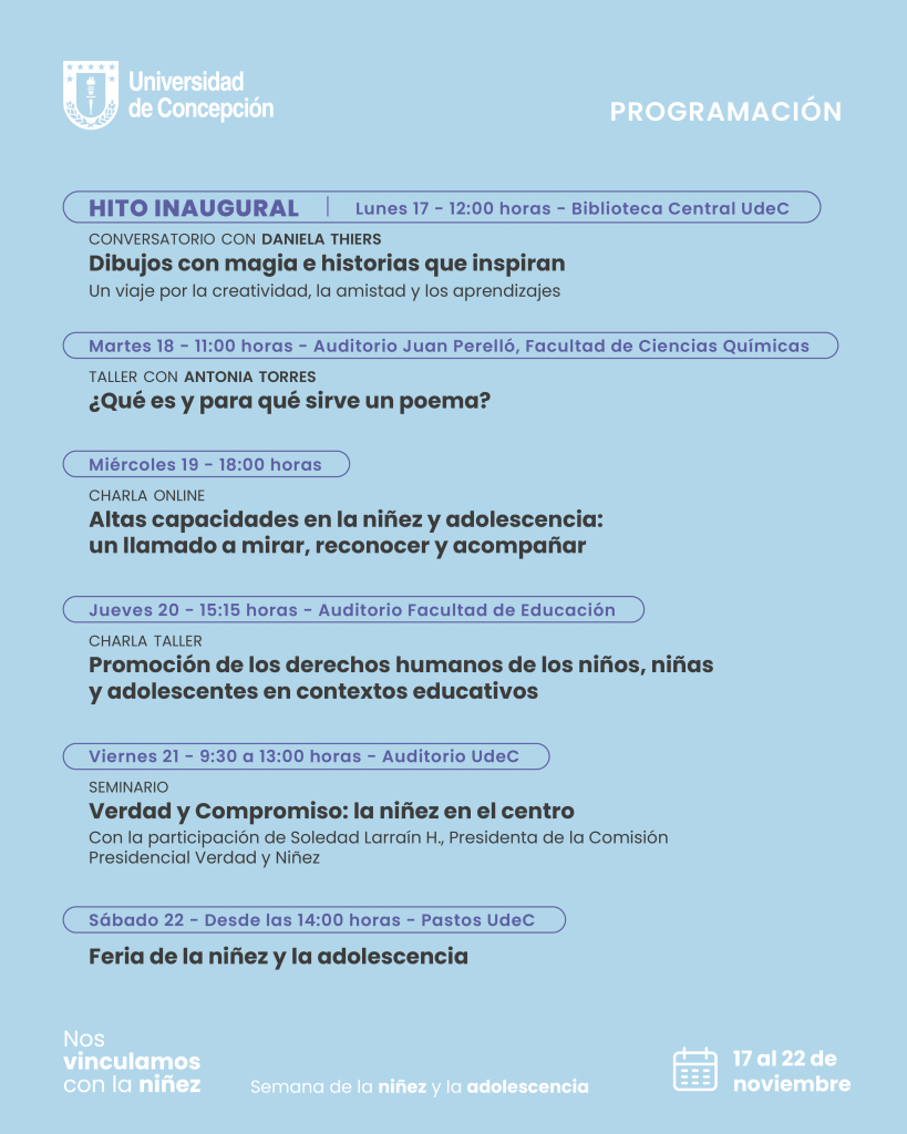 La Semana de la Niñez y Adolescencia se vivirá con fuerza en la Universidad de Concepción. Conmemoración que se desarrollará del 17 al 22 de noviembre bajo el slogan “Nos vinculamos con la niñez”. La iniciativa refuerza el compromiso institucional con la infancia y la adolescencia, enmarcado en una cultura de derechos humanos y en la promoción de entornos libres de violencia y discriminación.