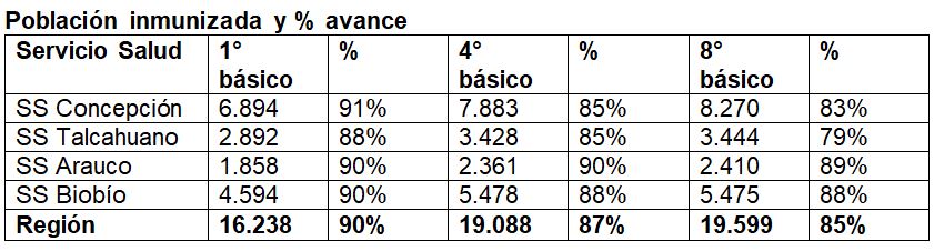 Un total de 54 mil 925 estudiantes inmunizados, de 63 mil 329 habilitados, da como resultado un 87 % de cobertura en la campaña de vacunación escolar 2025 durante noviembre en la Región del Biobío.
