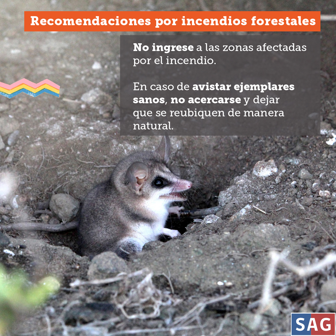 “Cuando se produce un incendio forestal los animales tienden a huir, buscando refugio en forma natural. Si usted se encuentra con ellos escapando, es mejor dejarlos que sigan su camino. Sin embargo, si están lesionados, heridos o con quemaduras, debemos intervenir, ya que requieren de nuestra ayuda. Por ello, solicitamos informar al Servicio para coordinar su atención oportuna o trasladarlo en forma directa a uno de los Centros de Rescate de Fauna Silvestre (CEREFAS) con convenio de colaboración con el SAG Biobío”, indicó la directiva del SAG.