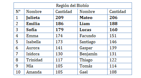 A nivel regional, durante 2025 los tres nombres más inscritos fueron Julieta, Emilia y Sofía en niñas, mientras que en niños lideraron Mateo, Liam y Lucas.