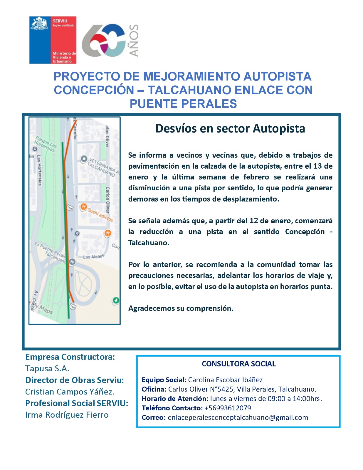 A contar de este lunes 12 de enero y hasta el 27 de febrero habrá una disminución de pistas en la Autopista en el tramo que va desde Monseñor Alarcón y Jaime Repullo, debido a los trabajos de construcción del Nuevo Puente Perales.
