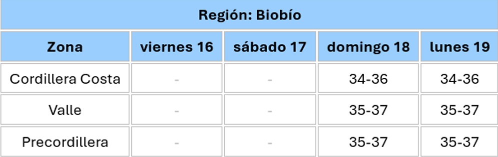 La medida fue actualizada este viernes 26 y advierte sobre temperaturas extremas que se presentarían entre el domingo 18 y el lunes 19 de enero, afectando principalmente a sectores de la Cordillera de la Costa, Valle y Precordillera de la Región del Biobío.