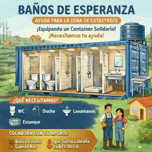 “El llamado principal es de sumar WC, receptáculos de ducha, lavaderos, lavamanos y también lavaplatos, que queremos dejar en el exterior. Y si alguien tiene un contenedor disponible, también se recibe para hacer uno. Y si no, pueden apoyar económicamente y podemos hacer baños modulares”, afirmó.
