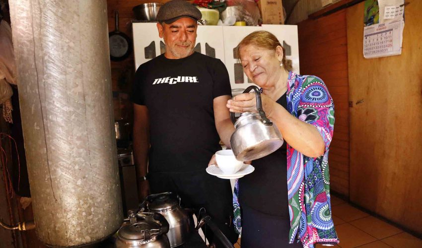 Junto a esta cocina, al interior de su hogar en Punta de Parra (Tomé) Margot logra servirle una taza de café a su hijo mayor, Héctor.
