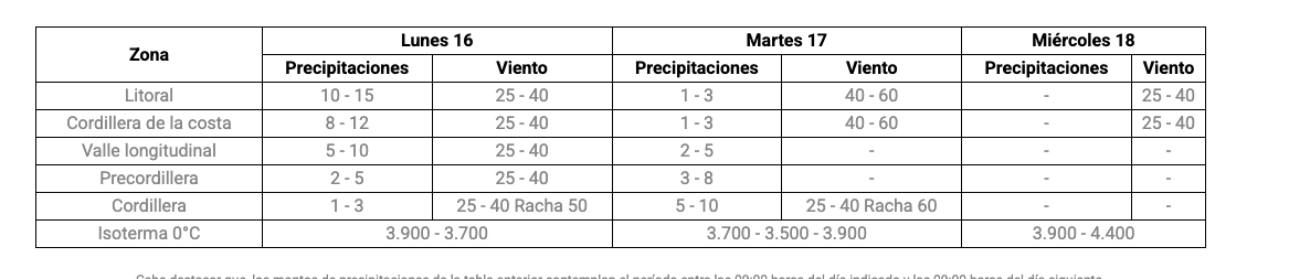 Según el reporte, en el alertamiento vigente y en Informe de Amenaza Meteorológica de la DMC, los montos pronosticados de precipitaciones, viento, e isoterma para los próximos días en la región, son los siguientes: