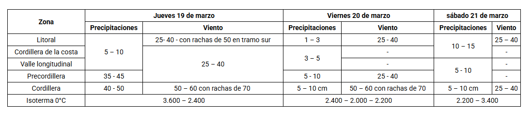 Asimismo, precisa que “Adicionalmente, conforme a lo indicado en el Informe de Amenaza Meteorológica de la DMC, los montos pronosticados de precipitaciones (mm), viento (km/h) e isoterma 0°C (m.s.n.m.) para los próximos días, son los siguientes:”