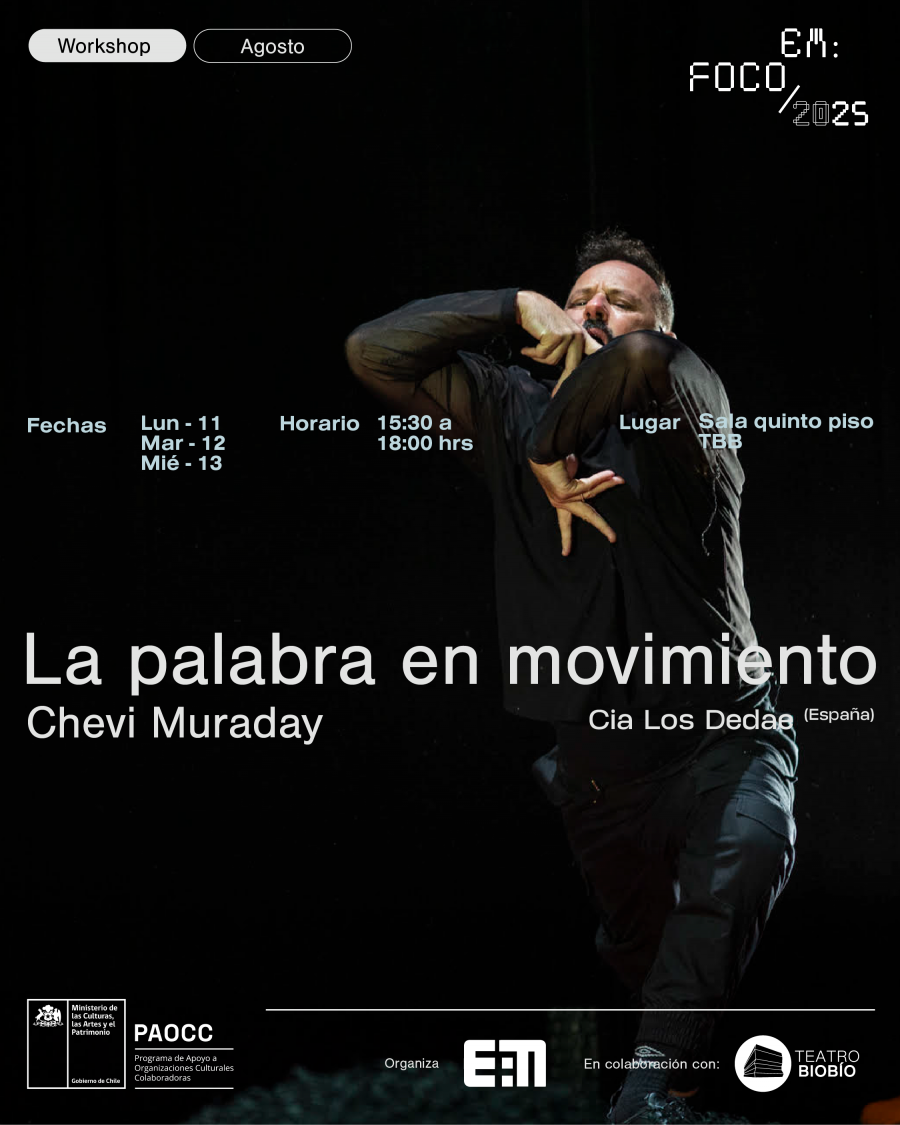Del 11 al 13 de agosto, el experimentado y reconocido coreógrafo español, Chevi Muraday, visitará la capital del Biobío para impartir un intensivo e integral entrenamiento. Se trata del workshop “La palabra en movimiento”, el cual se realizará en la sala del 5° piso del Teatro Biobío, desde el próximo lunes al miércoles 13 de agosto, entre las 15.30 a 18.00 horas.