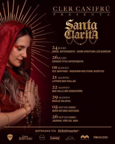 Luego de ser el número de apertura de Los Bunkers, el pasado 24 de julio en el Estadio Sokol de Antofagasta y como parte de la gira acústica que los penquista ha realizado en distintas ciudades del país, la guitarrista y compositora nacional Cler Canifrú emprendió su propio camino con el tour “Santa Clarita”, gira promocional de su último álbum, que tiene este mismo título, que este 22 de agosto llega al Bar Callejón.