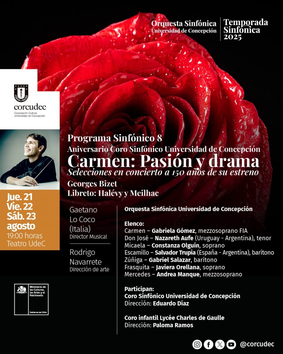 Este 21, 22 y 23 de agosto el Teatro UdeC se viste de fiesta con el despliegue del programa sinfónico N°8, el cual será para celebrar los 150 años que se cumplen del estreno de la ópera “Carmen”, obra que ha marcado la historia de la música y que sigue emocionando al público en todo el mundo; y también para festejar el 71° aniversario del Coro Sinfónico de la Universidad de Concepción.