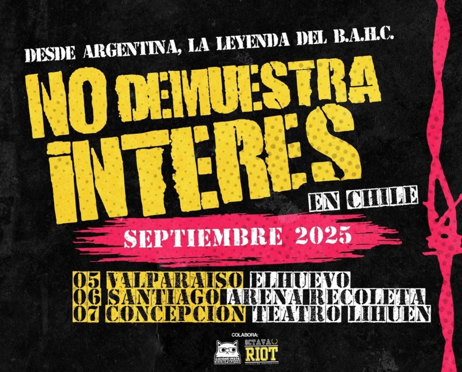 La banda argentina de hardcore punk No Demuestra Interés se presentará en Concepción el próximo 7 de septiembre en el Teatro Lihuén. Con 35 años de trayectoria, la leyenda de la escena de hardcore latinoamericano volverá a nuestro país para ofrecer también conciertos en Valparaíso y Santiago.