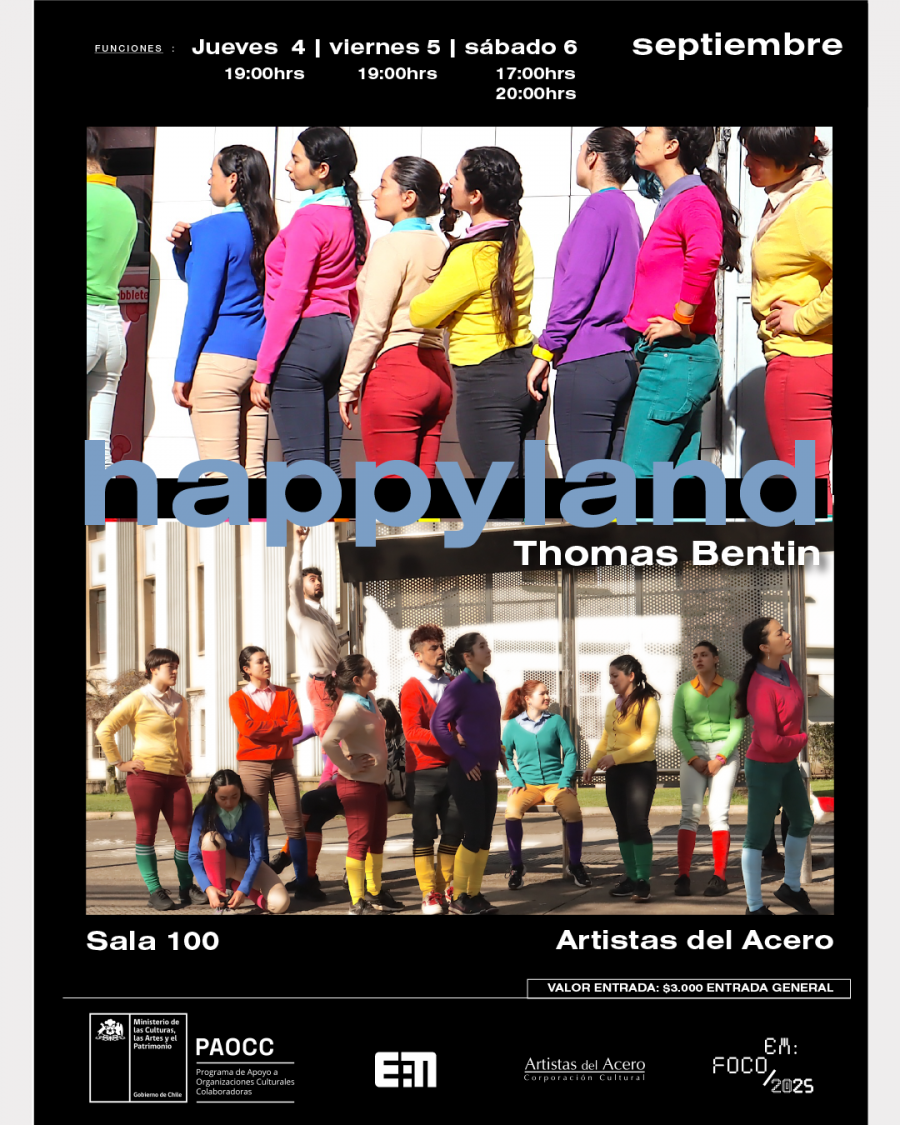 Puntualmente, las funciones de “Happyland” en Sala 100 -O”Higgins 1255- serán el jueves 4 y viernes 5 de septiembre a las 19.00 horas, y el sábado 6 de septiembre a las 17.00 y 20.00 horas. Las entradas tienen un valor general de $3.000 y se encuentran disponibles a través del sitio web de Artistas del Acero o en la cuenta de Instagram @escenicaenmovimiento.