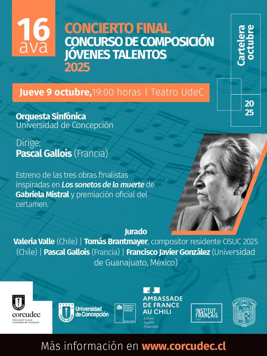 Para mañana a las 19.00 horas, en el Teatro UdeC, está pactada la jornada final de la 16ª versión del Concurso Jóvenes Talentos, instancia musical que este año está centra en la composición. Organizado por Corcudec, el certamen tiene como objetivo fomentar la creación musical contemporánea en jóvenes compositores y compositoras, reconociendo la originalidad, el manejo orquestal y la diversidad de lenguajes. Con cada edición, se consolida como un espacio clave para descubrir y potenciar nuevas voces, permitiendo que sus obras sean interpretadas por la Orquesta Sinfónica UdeC.