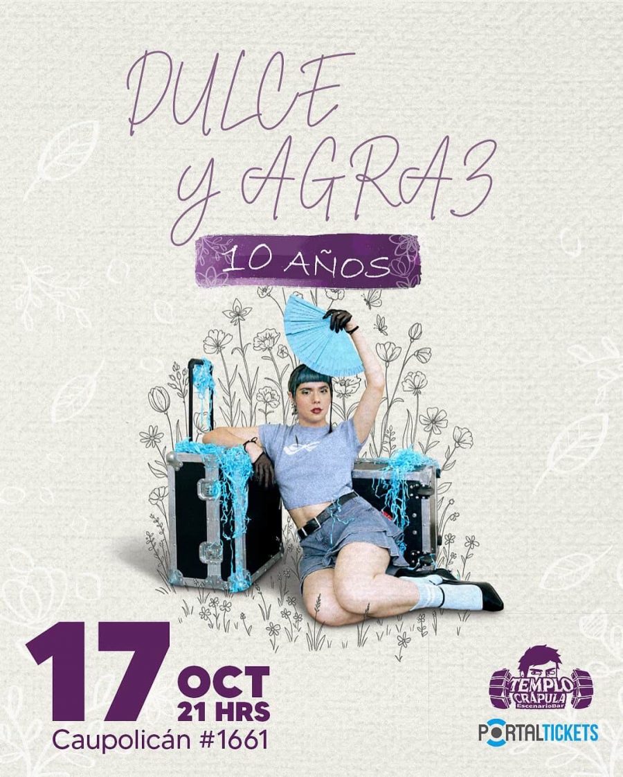La destacada cantautora penquista Dulce y Agraz se presentará este viernes 17 de octubre, a las 21:00 horas en el Bar y Cervecería Templo Crápula (Caupolicán 1661), en el marco de la celebración de sus diez años de trayectoria artística.