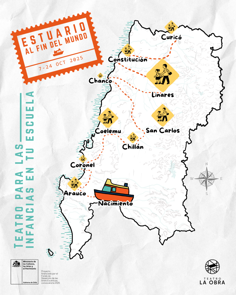 Durante octubre, la itinerancia recorrió las comunas de Arauco, Coronel, Nacimiento, Coelemu, Chillán, San Carlos, Constitución, Curicó, Linares y Chanco, llevando el teatro directamente a patios y salones escolares, en un circuito realizado junto a Productora Cambalache (Maule), Corporación Arte y Vida (Ñuble) y Gisel Sparza (Biobío), que generó encuentros significativos con niñas, niños y docentes.