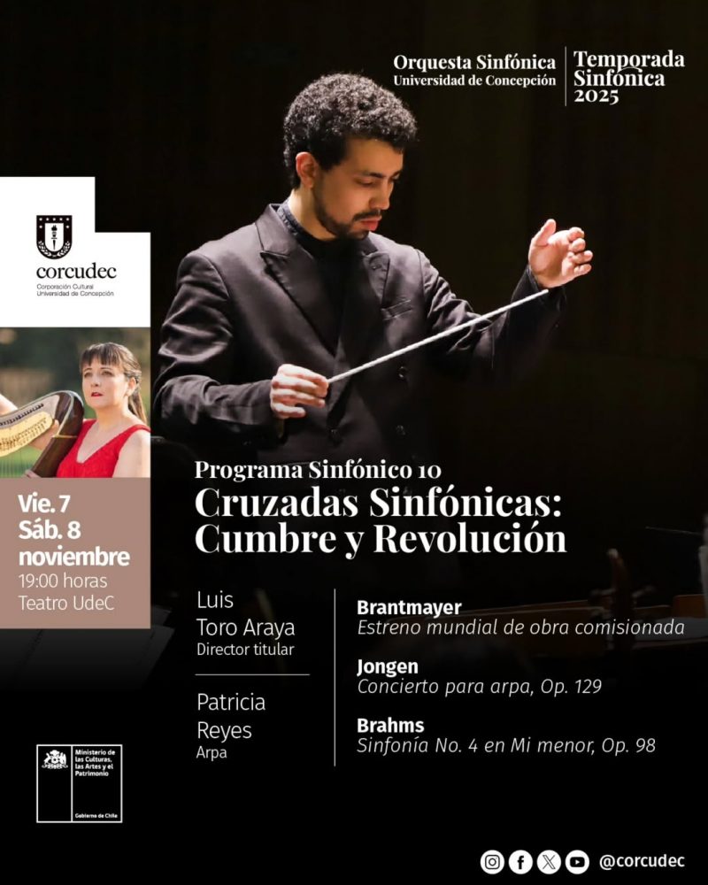 “Cruzadas Sinfónicas: Cumbre y Revolución” es el nombre que llevará el último concierto de la Temporada 2025 de la Orquesta Sinfónica UdeC, concierto cuya batuta estará a cargo del maestro Luis Toro Araya. Un vibrante y emocionante repertorio que estará compuesto por obras del compositor residente UdeC 2025 Tomás Brantmayer, la arpista Patricia Reyes y por el propio director titular. Despedida que está agendada para hoy y mañana a las 19.00 horas en el Teatro UdeC.