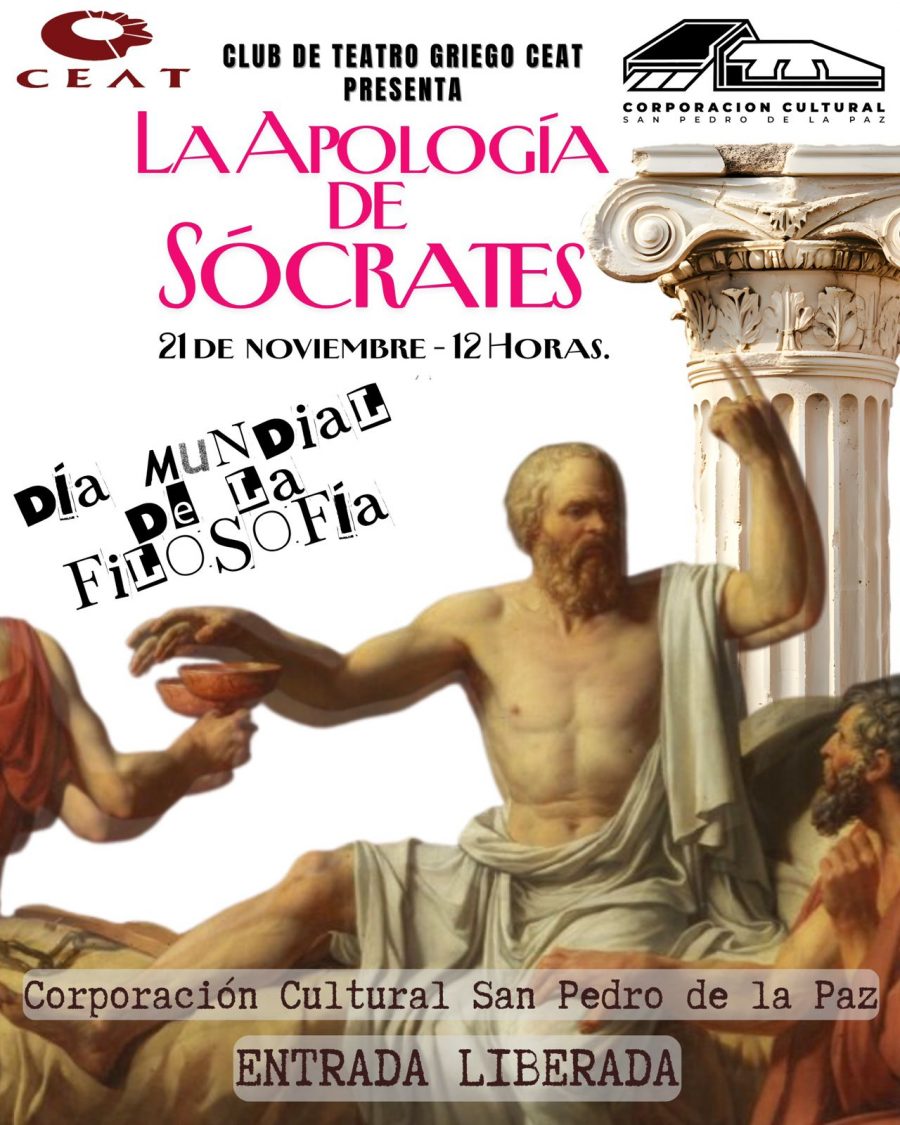 Para este viernes 21 de noviembre al mediodía, el Club de Teatro Griego del CEAT estrenará de forma gratuita la obra “La Apología de Sócrates”, teniendo como escenario la Corporación Cultural de San Pedro de la Paz (Los Fresnos 1640 a un costado del Parque Laguna Grande).