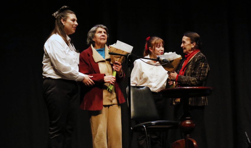 Al término de las presentaciones la actriz Gloria Varela junto a su par, Berta Quiero, recibieron el homenaje de la Universidad.