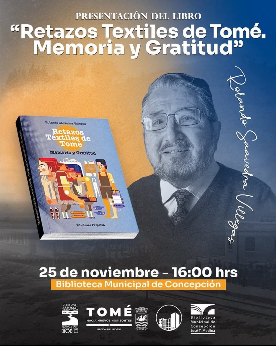 Para hoy a las 16:00 horas está agendado en la Biblioteca Municipal de Concepción, la presentación oficial del libro “Retazos textiles de Tomé. Memoria y Gratitud”, escrito por el historiador tomecino Rolando Saavedra Villegas.