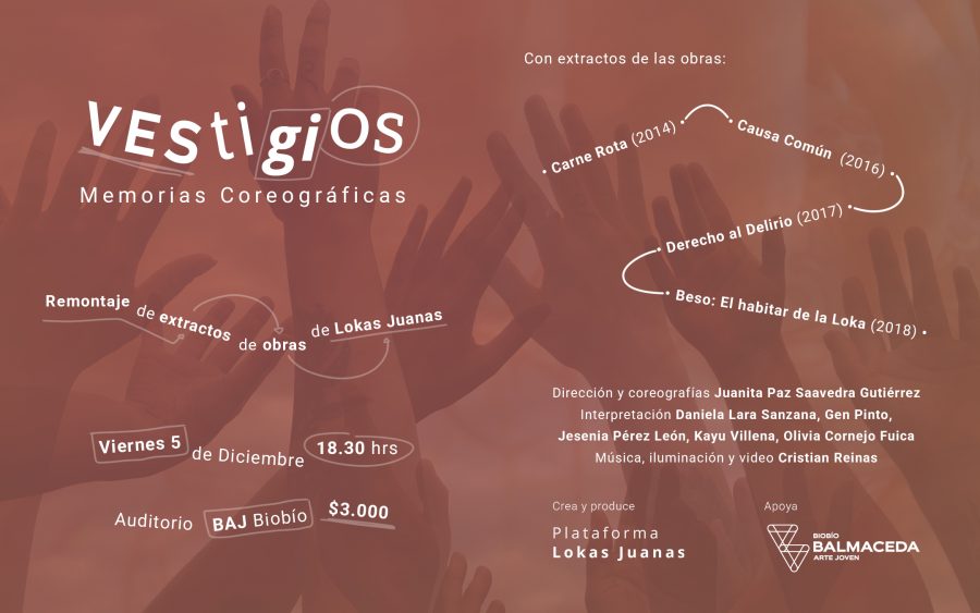 “Vestigios: Memorias Coreográficas” es la nueva propuesta de la plataforma de creación escénica Lokas Juanas, la cual se presentará este 5 de diciembre a las 18.30 horas en el auditorio de Balmaceda Arte Joven sede Biobío (Colo Colo 1855). Obra de danza contemporánea compuesta por extractos de algunas de sus trabajos anteriores como “Carne Rota” (2014), “Derecho al Delirio” (2016), “Causa Común” (2017) y “Beso: El habitar de la Loka” (2018). En esta instancia buscan conectar una revisión de su historia coreográfica con una nueva generación de intérpretes y espectadores.