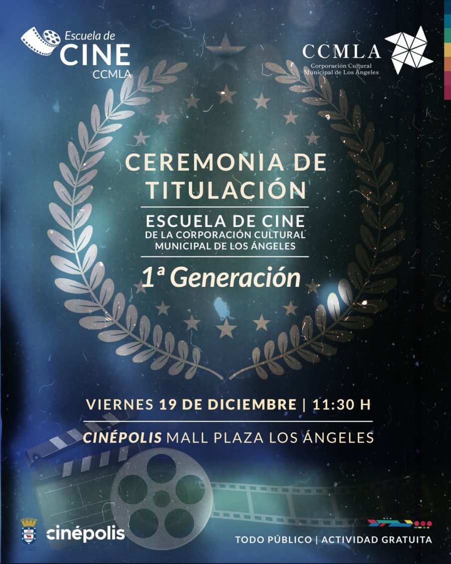 Con una emotiva ceremonia de titulación y la exhibición de obras cinematográficas en pantalla grande, la Escuela de Cine de la Corporación Cultural Municipal de Los Ángeles, dirigida por el destacado cineasta Juan Mora Cid, dará cierre a su año académico con la titulación de la primera generación de estudiantes. La actividad se realizará el viernes 19 de diciembre a las 11:30 horas en sala 2 de Cinépolis Mall Plaza Los Ángeles, gracias a una alianza estratégica que permitirá, por primera vez, exhibir los trabajos estudiantiles en una sala de cine profesional.