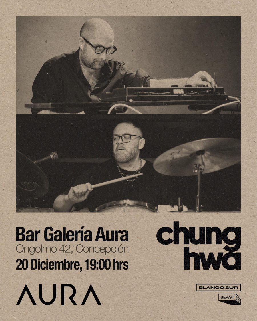 El dúo instrumental Chung Hwa se presentará este sábado 20 de diciembre en Bar Galería Aura (Ongolmo 42), show gratuito pactado desde las 19:00 horas, el cual marcará el cierre de un año especialmente fructífero para el proyecto, tras una intensa agenda de presentaciones en escenarios de Concepción y Santiago. La fecha no sólo representa el último concierto del año en la ciudad para el dúo, sino también el fin de la etapa de promoción de su EP homónimo, dando paso al inicio de un nuevo ciclo creativo, enfocado en la grabación de su próximo trabajo discográfico.