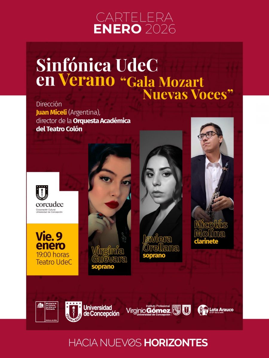 19.00 Horas. Concierto “Gala Mozart. Nuevas Voces”. Presentación especial de verano de la Orquesta Sinfónica UdeC dirigida por Juan Miceli junto a destacadas y jóvenes voces doctas. Variado repertorio en torno a la figura del clásico compositor austríaco. Teatro UdeC. Entradas disponibles vía Ticketplus.