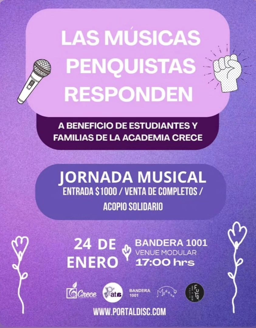 Este sábado 24 de enero de 2026, desde las 17:00 horas, se realizará en Centro Cultural Bandera 1001 la jornada solidaria “Las músicas penquistas responden: Jornada Musical”, evento a beneficio de estudiantes y familias de la Academia de Música Crece de Penco, quienes se vieron afectados por los incendios ocurridos durante este 2026.