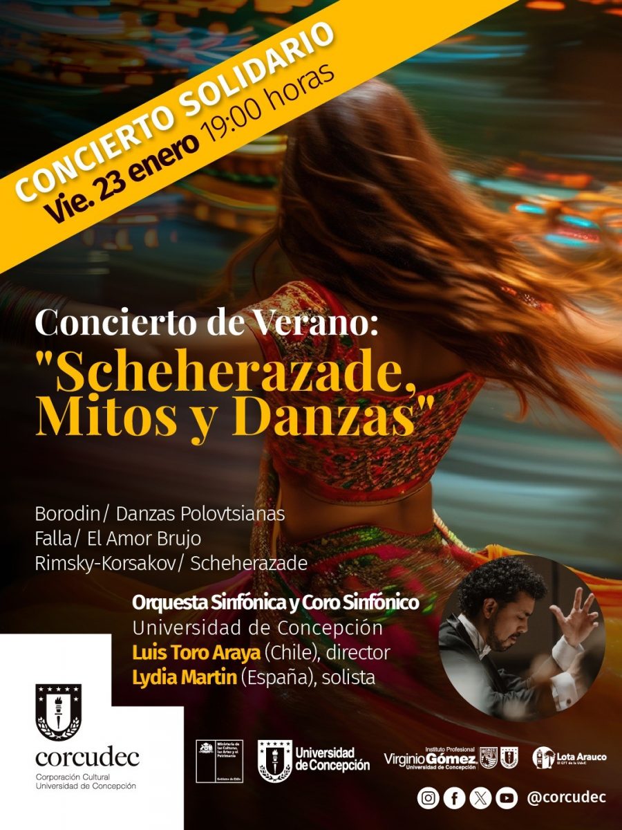 Tras los emocionantes y multitudinarios conciertos junto al cantante nacional Quique Neira en el contexto de la Escuela de Verano 2026 “Ampliando fronteras desde el sur del mundo”, la Orquesta y Coro UdeC continúan con su temporada estival de concierto con “Scheherazade: Mitos y Danzas”, presentación que se realizará este 23 y 24 de enero a las 19.00 y 18.00 horas en el Teatro UdeC, respectivamente.
