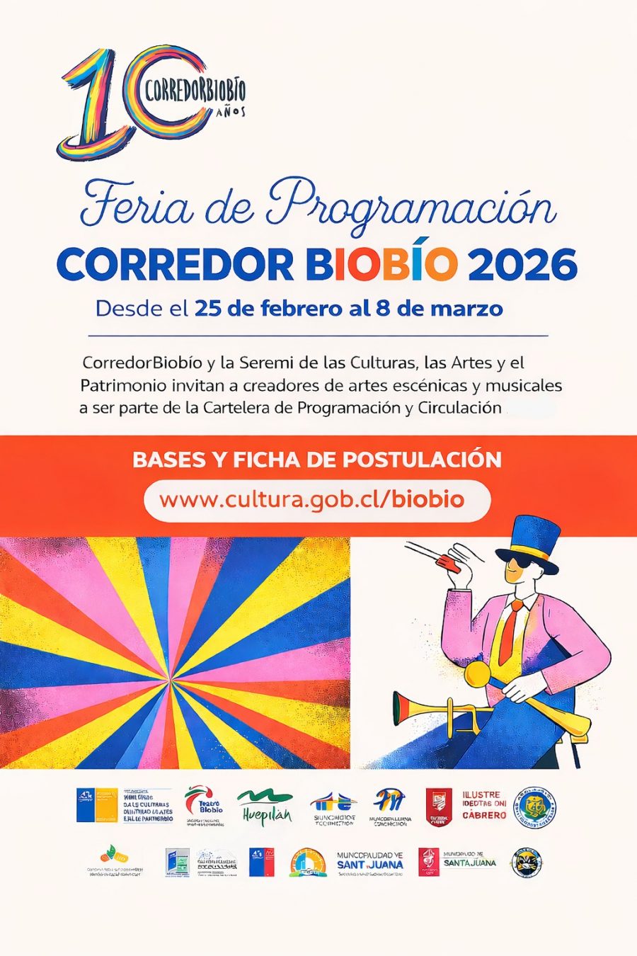 Es una iniciativa que es un hito fijo de cada temporada cultural en el Gran Concepción y de la Región en general, abriendo oportunidades de exhibición y circulación de la prolífica creación artístico cultural del Biobío, y que este año en particular celebrará una década de trayectoria. La comunidad Corredorbiobío (CBB), integrada por 17 espacios culturales municipales del Biobío e impulsada por la Seremi de las Culturas, las Artes y el Patrimonio a través del Programa de Fortalecimiento de la Identidad Cultural Regional (FICR), en camino de los festejos de sus 10 años de vida acaba de abrir la convocatoria para participar en su Feria de Programación 2026, cuya realización se proyecta para la primera semana de abril. Esta iniciativa busca descentralizar la cultura, promover la circulación de proyectos artísticos regionales y fortalecer la programación en las distintas comunas que forman parte de la red.