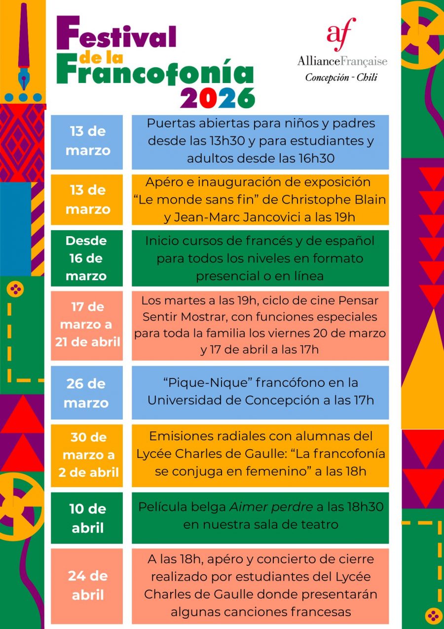 En nuestra ciudad, la Alianza Francesa hará lo propio con un calendario diverso y abierto para toda la comunidad penquista, con el fin de festejar esta destacada efeméride internacional. Parrilla que incluirá cursos de francés -en diversos niveles-, una exposición gráfica, exhibición de películas y más. “La idea es que sea abierto para todo el público, o sea, el hito central es nuestra actividad de Puertas Abiertas, que contempla iniciación al francés con descuentos, juegos de mesa, cuenta cuentos y desgustación de crêpes. Todo el equipo de la Alianza Francesa guiará a las familias en una visita lúdica”, dijo Sophie Moulin, nueva directora de la Alianza Francesa en Concepción.