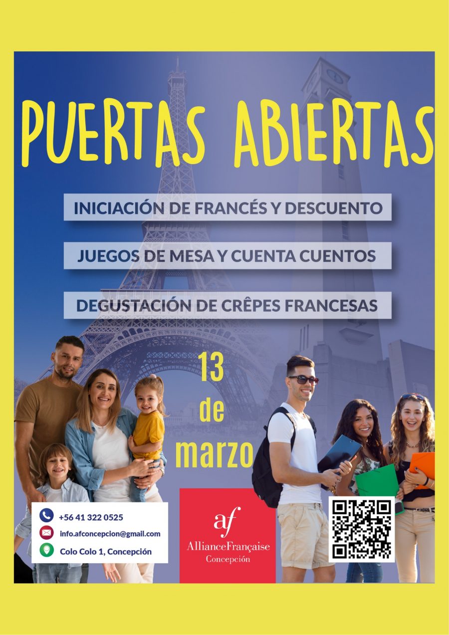13.30 Horas. Puertas abiertas Mes de la Francofonía de la Alianza Francesa. Jornada dedicada a niños, niñas, adultos y estudiantes para conocer la distinta oferta de cursos para aprender francés, en sus distintos niveles y modalidades. Habrán juegos, cuentacuentos, degustación de crepés y más para conocer la cultura francesa. Culminará a las 18.30 horas con la inauguración de la exposición “Le Monde sans fin”, de Christophe Blain y Jean-Marc Jancovici. Alianza Francesa, Colo Colo 1.