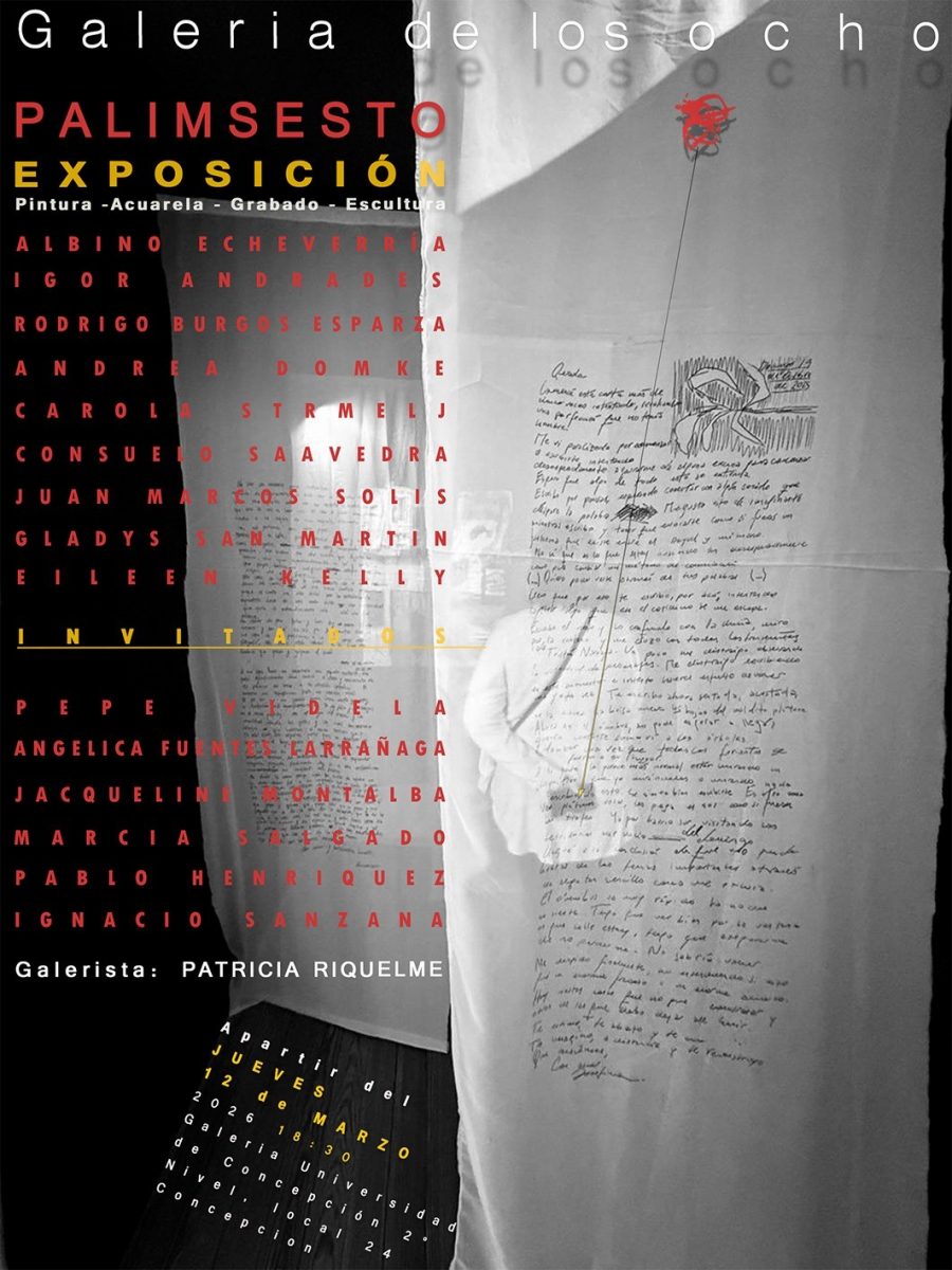 11.00 Horas. Exposición “Palimsesto” de Galería de los Ocho. Primera muestra que abre la temporada 2026 de este espacio visual penquista. Artistas invitados en esta oportunidad Pepe Videla, Angélica Fuentes Larrañaga, Jacqueline Montalba, Pablo Henríquez, Marcia Salgado e Ignacio Sanzana. Galería Universidad de Concepción, segundo nivel Local 25. Entrada liberada.