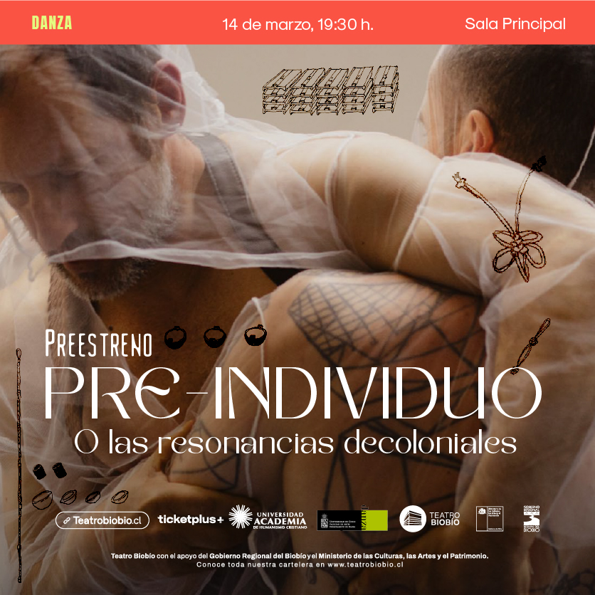 19.30 Horas. Preestreno de la obra de danza “Pre-individuo o las resonancias precoloniales”. Investigación escénica que explora la relación entre cuerpo y objetos cotidianos (greda, cuero, tul) como “transductores” de memoria. Mediante la danza y la performance, cuatro intérpretes activan una ecología donde la materia y el gesto dialogan para actualizar saberes y temporalidades pre-individuales. Sala principal del Teatro Biobío. Entrada liberada previa descarga en Ticketplus.