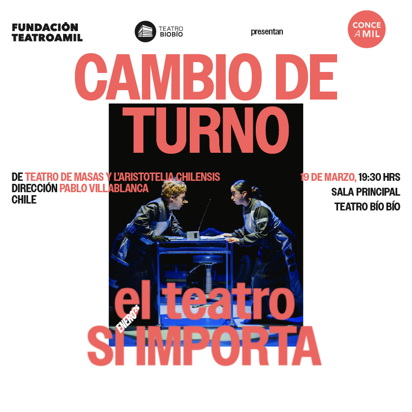 19.30 Horas. Función de la obra “Cambio de turno”, de Teatro de Masas y L’Aristotelia Chilensis. Presentación en el contexto del festival Conce a Mil, reagendada por los incendios forestales ocurridos en la zona durante el verano. Planteada escénicamente desde el misterio y la ciencia ficción, la obra cuenta la historia de Nora, mujer que trabaja en una industria ubicada en el Biobío, en el año 1991. Entradas disponibles en Ticketplus.cl.