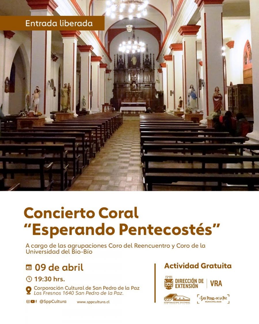 El concierto coral “Esperando Pentecostés” dará inicio mañana a las 19.30 horas a la XXVII temporada de Cantar Coral del Bío Bío, el cual tendrá como escenario a la Corporación Cultural de San Pedro de la Paz. La actividad gratuita contará con la participación del Coro del Reencuentro, integrado por exalumnos de la UdeC, y del Coro UBB, ambas agrupaciones con una destacada trayectoria en el desarrollo del canto coral en la Región.