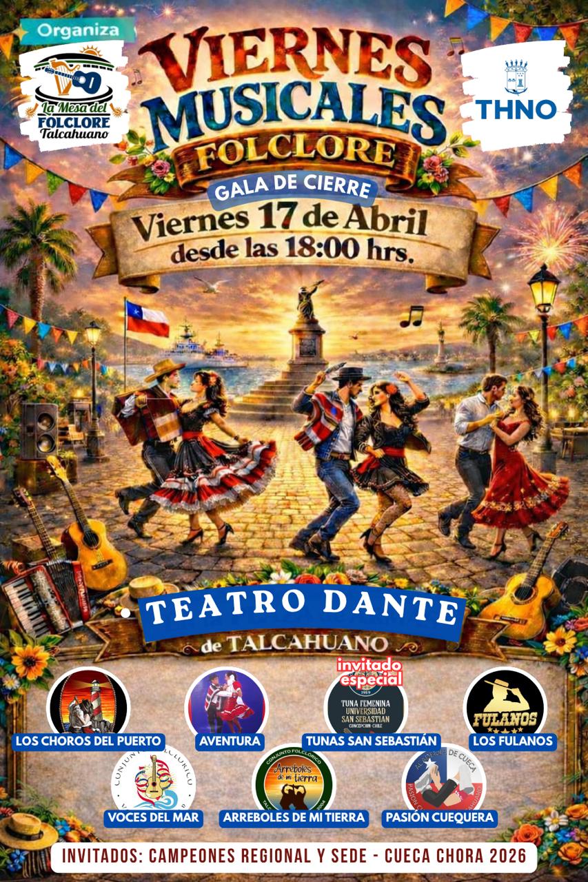18.00 Horas. Gala de cierre de los Viernes Musicales de Folclore en Talcahuano. Presentación de los grupos Los Choros del Puerto, Aventura, Los Fulanos, Arreboles de mi Tierra y Voces del Mar (en la imagen). Invitados especiales las Tunas San Sebastián y campeones regionales y sede Cueca Chora 2026. Centro Cultural Teatro Dante (Aníbal Pinto 107, Talcahuano). Entrada liberada.